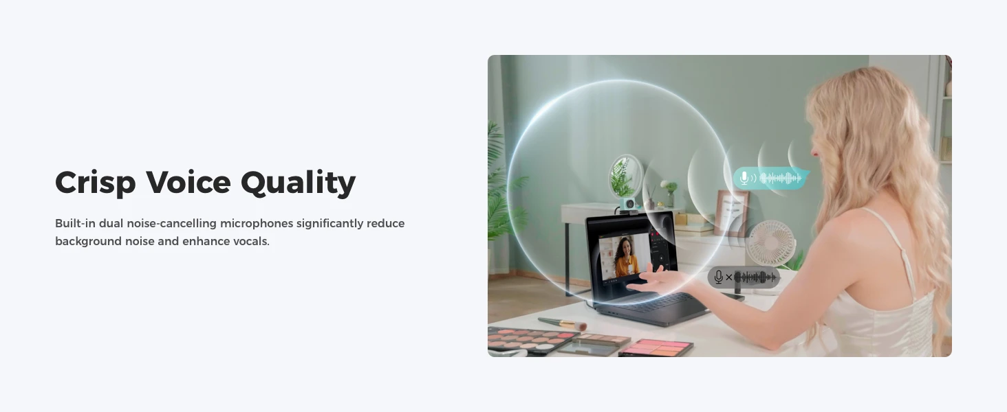 Dual Omni-directional Noise-Canceling Mics: Webcam with microphone capture clear sound while adjusting the noise reduction level according to the scene. Easily filter out wind noise, keyboard typing and other ambient noise.