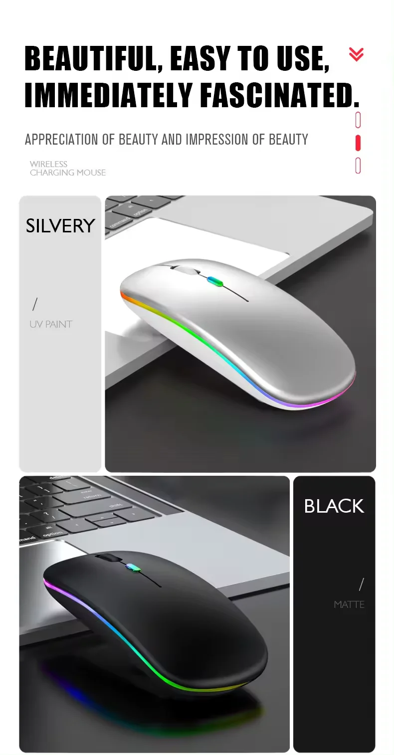 Wireless mouse with Bluetooth connectivity, rechargeable design, and 2.4 GHz USB receiver, featuring a modern ultra-thin build, 1600 DPI sensitivity, and 6 buttons, ideal for gaming and compatible with PC, laptop, and MacBook